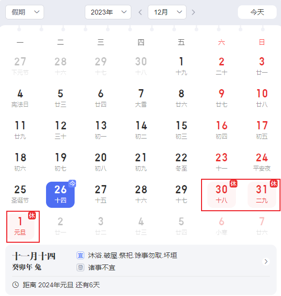 2023年12月30日(周六)放假休息,2024年01月02日(周二)開始恢復(fù)上班。