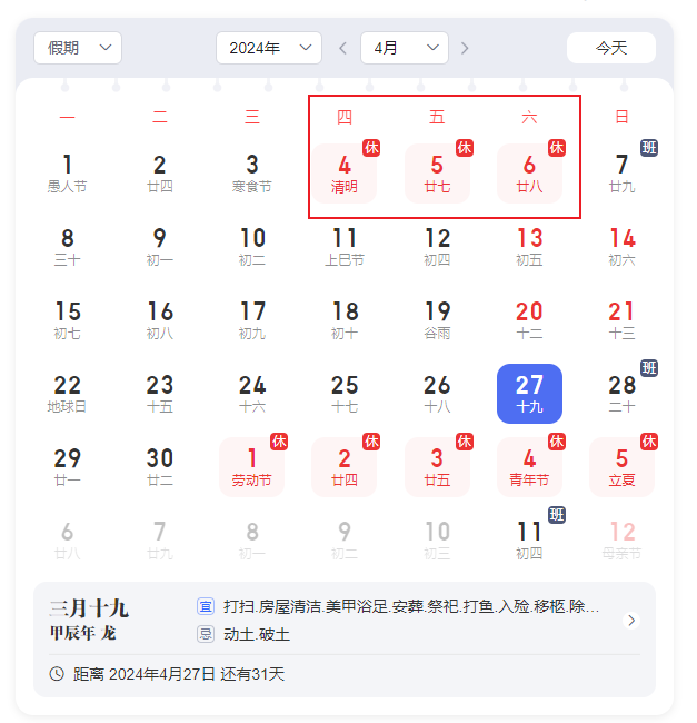 2024年04月04日(周四)放假休息,2024年04月07日(周日)開(kāi)始恢復(fù)上班。